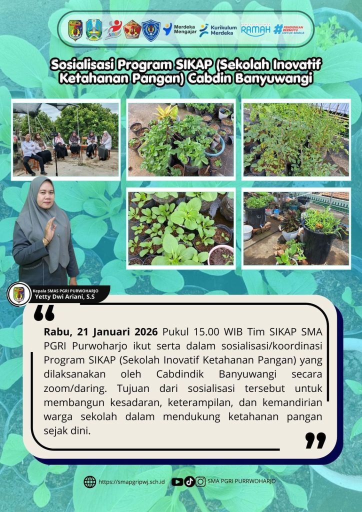 Tim SIKAP SMA PGRI Purwoharjo mengikuti sosialisasi dan koordinasi Program Sekolah Inovatif Ketahanan Pangan (SIKAP) yang diselenggarakan oleh Cabang Dinas Pendidikan Banyuwangi secara daring.