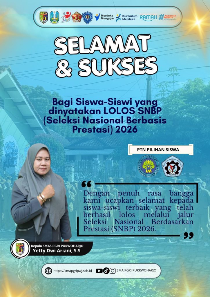 Keluarga Besar SMAS PGRI Purwoharjo mengucapkan Selamat & Sukses kepada seluruh siswa-siswi terbaik kami yang telah dinyatakan LOLOS SNBP (Seleksi Nasional Berbasis Prestasi) 2026.