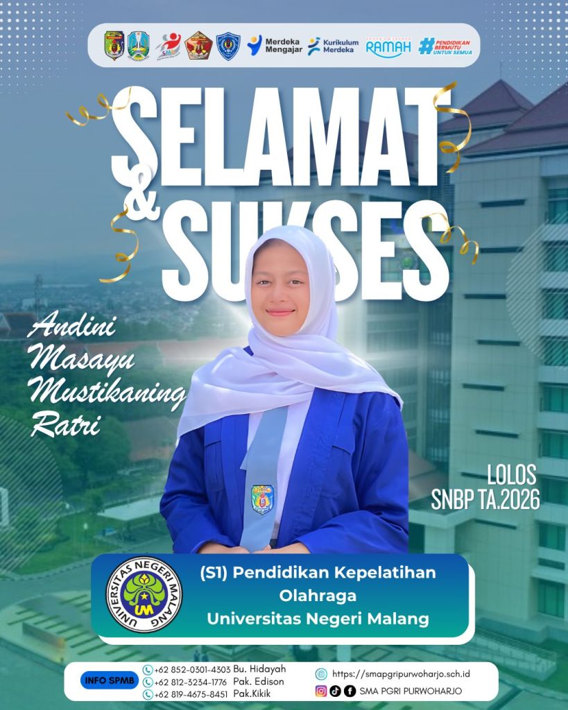SMA PGRI Purwoharjo dengan bangga mengucapkan selamat dan sukses kepada para siswa terbaik yang telah berhasil lolos Seleksi Nasional Berdasarkan Prestasi (SNBP) Tahun Akademik 2026.